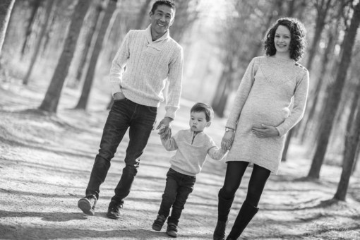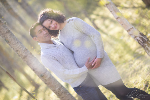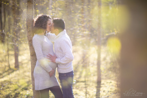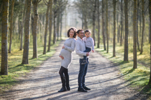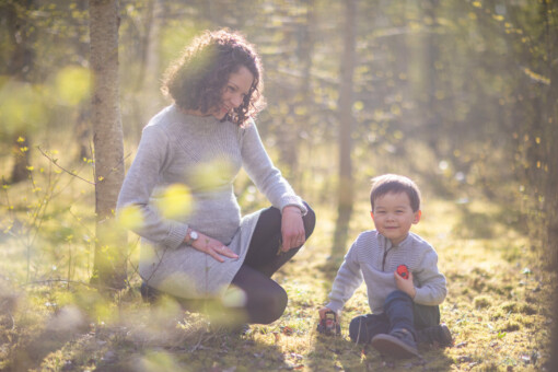 Séance Grossesse en foret pour des clichés pleins de lumière et de spontanéité, et séance Naissance en Studio dans un cocon de douceur.