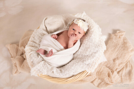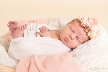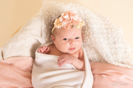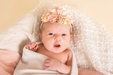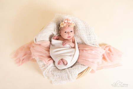 Pour ses photos de naissance, Alice a été tellement parfaite qu’en plus de toutes les photos prévues nous avons pu tester le nouveau fond fleuri qui venait d’arriver au studio !