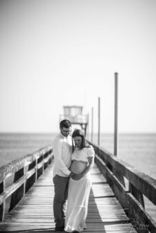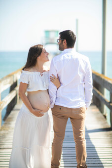 On profite des belles lumières du matin pour réaliser des photos de Grossesse en bord de plage.